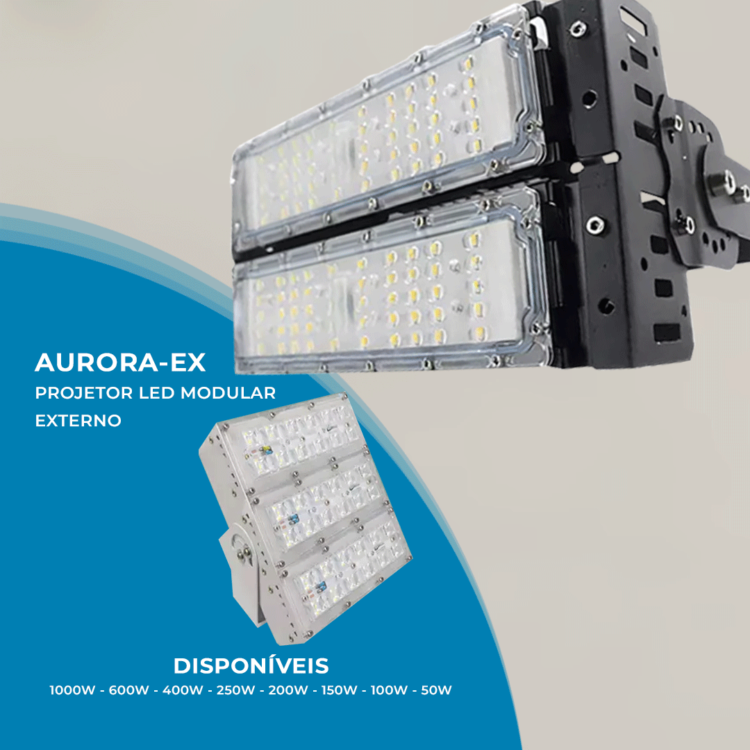 O PROJETOR LED PARA ILUMINAÇÃO EXTERNA AURORA-EX foi projetado para ambientes exigentes, que demandam desempenho técnico elevado e resistência às condições climáticas mais adversas. Por isso, ele se destaca entre os melhores equipamentos do mercado para iluminação de áreas amplas. Além disso, sua estrutura modular, combinada com potência elevada e lentes assimétricas, o torna ideal para projetos urbanos e esportivos de grande escala.