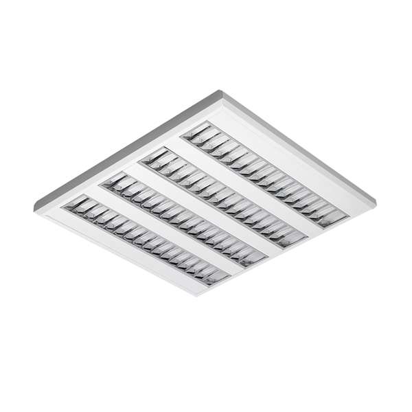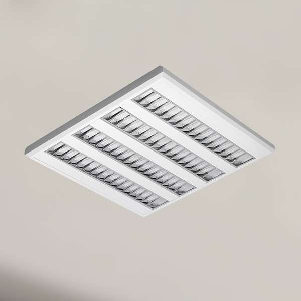 Luminária quadrada LED de sobrepor com corpo em chapa de aço e pintura eletrostática, refletor e aletas em alumínio com película difusora translúcida.