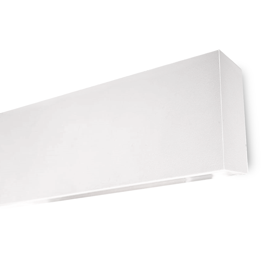 Perfil LED de sobrepor, corpo em alumínio com pintura eletrostática e difusor translúcido.